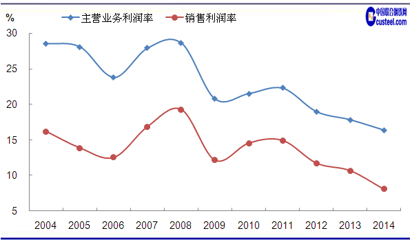 圖2 2004-2014年鐵礦采選業(yè)主營(yíng)業(yè)務(wù)利潤(rùn)率和銷售利潤(rùn)率變化走勢(shì) 數(shù)據(jù)來(lái)源:中國(guó)統(tǒng)計(jì)局