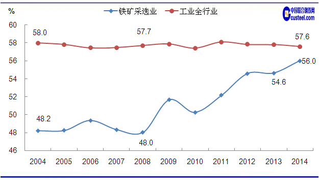 經(jīng)營(yíng)效益的下滑和虧損情況的惡化,使鐵礦采選行業(yè)的債務(wù)負(fù)擔(dān)近年來(lái)呈增長(zhǎng)態(tài)勢(shì)。統(tǒng)計(jì)數(shù)據(jù)顯示,2004-2008年間,鐵礦采選行業(yè)的資產(chǎn)負(fù)債率一直在50%以下,處于極為健康的水平,其中在2008年鐵礦業(yè)的高峰期,部分礦山企業(yè)每噸成品礦的毛利潤(rùn)甚至可達(dá)到約1000元/噸,使行業(yè)盈利水平保持高位,行業(yè)資產(chǎn)負(fù)債率也降至48%的歷史低點(diǎn)。但從2009年開(kāi)始,鐵礦業(yè)負(fù)債情況隨著行業(yè)效益的下滑而持續(xù)升高,到2014年1-2月間已經(jīng)達(dá)到56%。而與工業(yè)全行業(yè)的資產(chǎn)負(fù)債率相比,兩者之間的剪刀差也不斷縮小,甚至鐵礦采選業(yè)的負(fù)債水平已經(jīng)十分接近于全行業(yè)平均水平。