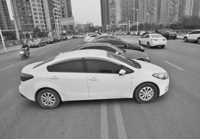 機(jī)動(dòng)車道的雙黃線上成了停車場(chǎng)