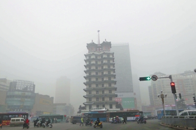 霧霾天里,鄭州二七廣場(chǎng)附近的建筑若隱若現(xiàn)?!∮浾甙字芊鍞z影