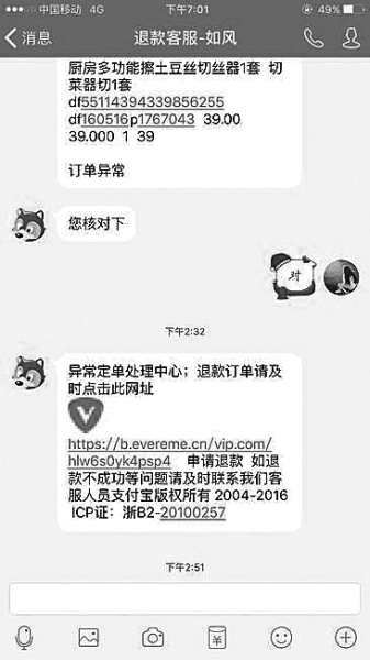 “退款不是直接可以退還到綁定的銀行卡嗎?”小帆有些疑惑。聽(tīng)出小帆質(zhì)疑的意思之后,對(duì)方直接一口氣報(bào)出了小帆的個(gè)人信息,包括姓名、手機(jī)號(hào)、郵寄地址、所購(gòu)商品的單號(hào)、下單的時(shí)間等。男子讓小帆加了一個(gè)QQ號(hào),號(hào)碼名字叫“退款客服-如風(fēng)”,并將小帆的訂單信息發(fā)給她。見(jiàn)這一狀況,小帆放松了戒備。