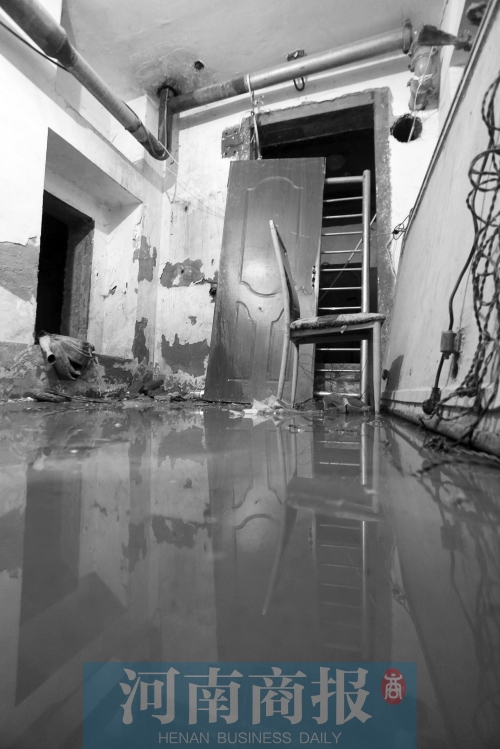 在負一樓,潮氣更重,地面上橫七豎八地擺放著很多雜物,循著滴水聲向上看,一節(jié)生銹的水管道外壁上沾滿了水珠,水珠不停地往下滴。地面一側(cè)便是電梯井,記者打開燈照進去,發(fā)現(xiàn)里面還有一些積水。