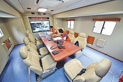 該車整車自重16噸,在車輛內(nèi)部,有一個(gè)近20平方米的會(huì)議室,能同時(shí)坐下十多人。