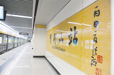 記者昨日走訪地鐵2號(hào)線各車(chē)站時(shí)發(fā)現(xiàn),車(chē)站內(nèi)部裝修工作已基本完成,車(chē)站站名墻首次采用書(shū)法藝術(shù)字體。