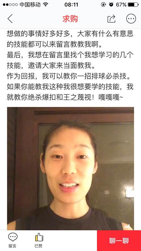 拜MVP為師,難道僅憑一招扯燴面的手藝?8月27日,女排主攻手朱婷在某分享經(jīng)濟平臺發(fā)布了求購視頻,透露了自己在緊張的訓(xùn)練之余,希望學(xué)到諸如土耳其語、做燴面等新技能。而作為交換,她愿教對方一招“絕殺暴扣”和“王之蔑視”!中國女排MVP上網(wǎng)“賣藝”,分享經(jīng)濟的玩法說火就火。