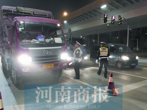 14日夜間開始,交警部門在鄭州市的三環(huán)和四環(huán)重要路口等處部署警力,展開嚴查。截至15日凌晨近2時,在鄭州市的統(tǒng)一行動中共查處貨車、渣土車等161輛,處罰駕駛?cè)?3名。
