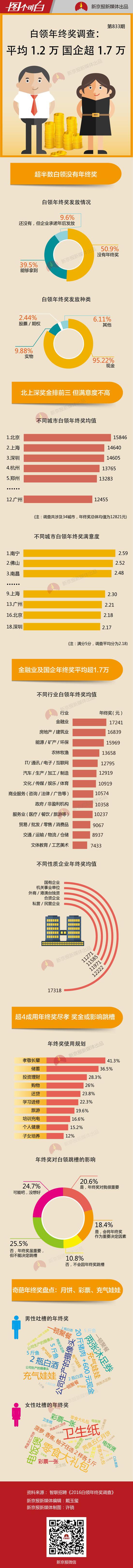 春節(jié)將至,“年終獎”又成了眾人關注的話題。近日,智聯(lián)招聘發(fā)布《2016白領年終獎調查》,調查通過對11526份有效問卷分析顯示,涉及的34城市年終獎總體均值為12821元。其中,北京最高,為15846元,上海和深圳次之。不過,三個城市的白領對年終獎的滿意度并不是很高。