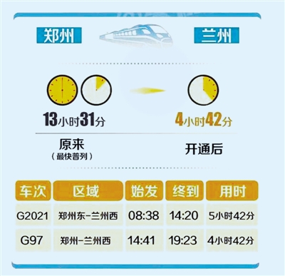 據(jù)鄭州東站工作人員介紹,即日起鄭州東站每天將有18趟往返蘭州的高鐵列車(具體列車車次、開行日期以12306網(wǎng)站以及車站公告為主),其中始發(fā)高鐵列車3趟。鄭州到蘭州最快的車次為G97,從鄭州車站至蘭州西站,中間經(jīng)停西安北、天水南站,全程僅需4小時(shí)42分。這較之前最快的Z265次列車足足縮短了將近8個(gè)小時(shí)。