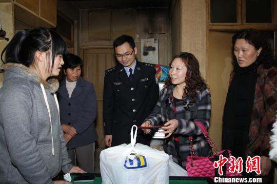圖為浙江臺州椒江警方于28日到李某親屬家中探望正處于康復(fù)期的“帶毒”小嬰兒,并送上愛心捐款和奶粉等慰問品。