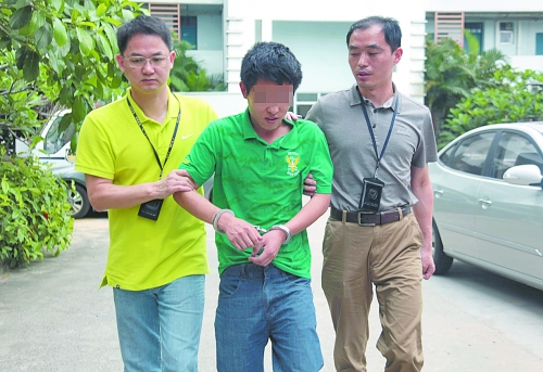 昨日,深圳警方將多次撥打電話謊稱飛機(jī)上有炸彈的犯罪嫌疑人王某(中)刑拘。 新華社發(fā)