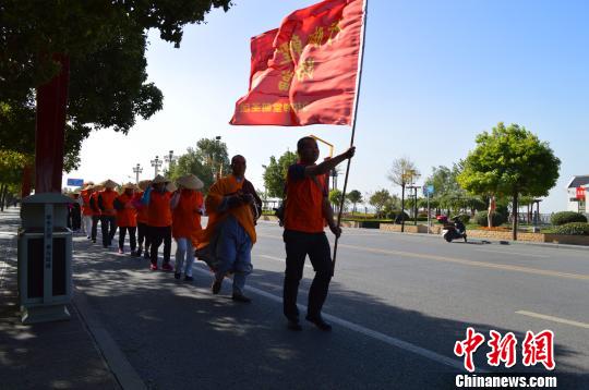 圖為朝圣團(tuán)一行30人在少林寺延偵法師、延宗法師的帶領(lǐng)下,徒步行腳?!∩倭炙鹿﹫D 攝圖為朝圣團(tuán)一行30人在少林寺延偵法師、延宗法師的帶領(lǐng)下,徒步行腳。 少林寺供圖 攝