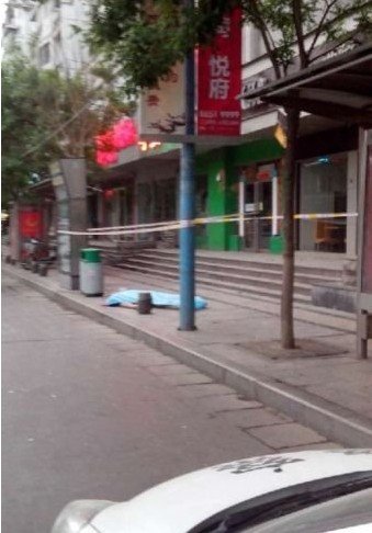 剛跑幾步,就聽到“咚”的一聲響了,回頭一看,一名男子掉在垃圾桶旁的人行道上,只穿了一條黑色內(nèi)褲,滿身是血,“從沒見過這樣的場面,我嚇住了,身上沒有電話,只能喊人”。