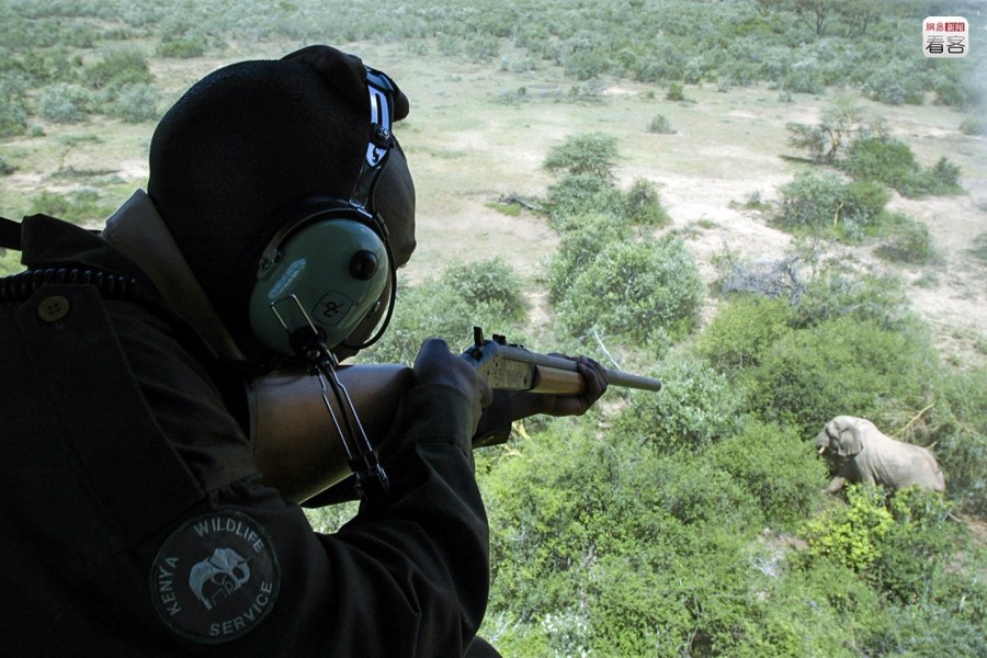 為了打擊武裝盜獵分子,非洲一些國家組建了特種部隊,以加強(qiáng)國家公園的護(hù)衛(wèi)工作,但難以阻擋偷獵者的殺戮。圖為2008年3月18日,肯尼亞內(nèi)羅畢,一名肯尼亞野生動物保護(hù)局官員向一頭大象發(fā)射鎮(zhèn)靜劑標(biāo),以裝載GPS跟蹤器,監(jiān)管其活動范圍和運動模式,幫助防止偷獵者靠近。REUTERS