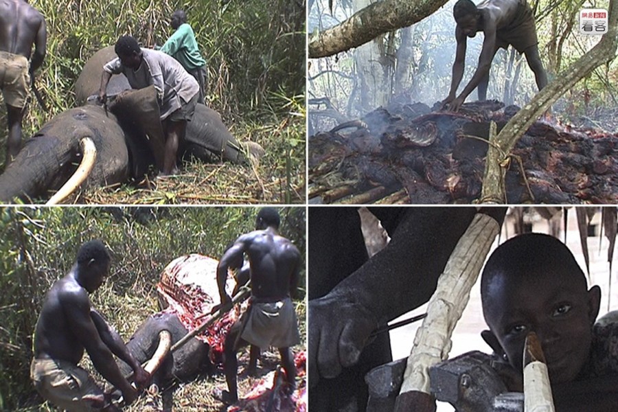 組圖為當(dāng)?shù)貢r間2007年5月3日,一名野生動物攝影師偷拍到非洲偷獵者獵殺大象象牙和肉的畫面。圖左上為偷獵者在槍擊完大象之后使用割刀割下大象的肉;左下為偷獵者使用棍子準(zhǔn)備獲取象牙;右上為偷獵者熏烤割下的大象肉;右下為偷獵者展現(xiàn)獲得象牙。AP Photo/Courtesy Karl Amman