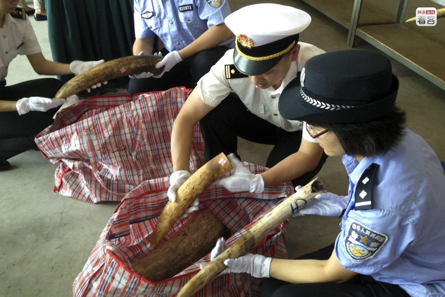 2013年6月19日,廣東東莞,黃埔海關(guān)監(jiān)管倉庫內(nèi),警察在清點一走私團(tuán)伙裝在蛇皮袋里的走私象牙。該團(tuán)伙首先在非洲購買象牙,然后以海運方式將走私象牙夾藏在紅豆、廢塑料等貨物中,瞞報進(jìn)口至香港,并伺機(jī)用摩托艇分批從香港海上偷運走私至內(nèi)地銷售,構(gòu)成“非洲購貨—香港中轉(zhuǎn)—偷運闖關(guān)—國內(nèi)販賣”的完整走私鏈條。CFP