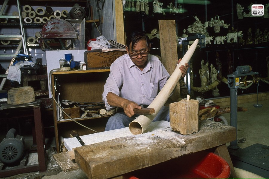 在合法原料中摻入非法原料,走私象牙就被“洗白”,這成為行業(yè)內(nèi)一個公開的秘密。一個合法收藏證,可以成為眾多非法象牙制品的“護(hù)身符”。圖為1989年7月,香港,一名象牙雕刻師在工廠工作。Photo by Tom Stoddart/Getty Images