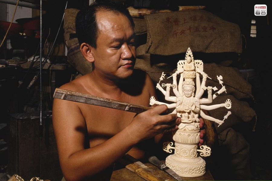 與國際呼聲背道而馳的是中國收藏家對象牙雕刻作品的狂熱。象牙作為一種雕刻的原料,再加上精細(xì)的雕工,所制成的工藝品往往成為收藏家們爭相收藏的對象。圖為當(dāng)?shù)貢r間2010年7月14日,香港,一名象牙雕刻師展示他的猛犸象牙雕刻作品。AFP PHOTO/MIKE CLARKE