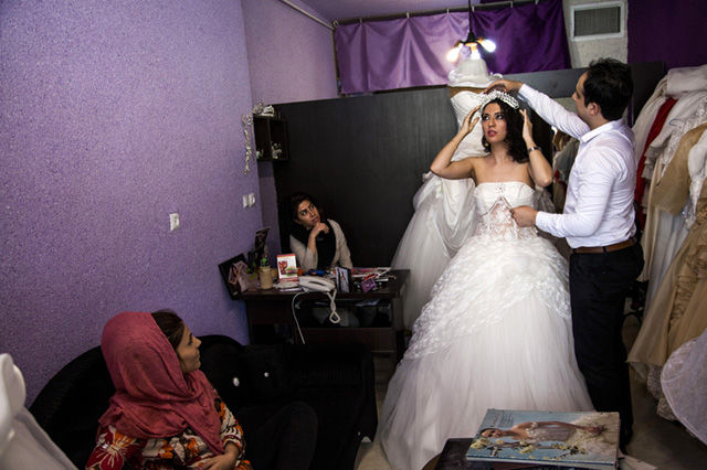 在一個婚紗店里,一名男性在幫一名女性調(diào)整頭飾。一名不相關(guān)的男性和女性在這種情況下是被禁止呆在一起的,這件裙子擺放在店內(nèi)的某個角落,從大街上是看不到的。