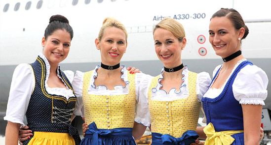 漢莎公司空姐2005年改穿這種巴伐利亞傳統(tǒng)制服,當(dāng)時(shí)恰逢每年一度的慕尼黑啤酒節(jié)。2014年,漢莎公司從慕尼黑前往北京、圣保羅以及墨西哥城的長途航班上,乘務(wù)員都穿起傳統(tǒng)服裝??战愦S色緊身衣,上面印有藍(lán)花,配上藍(lán)白相間的裙子。