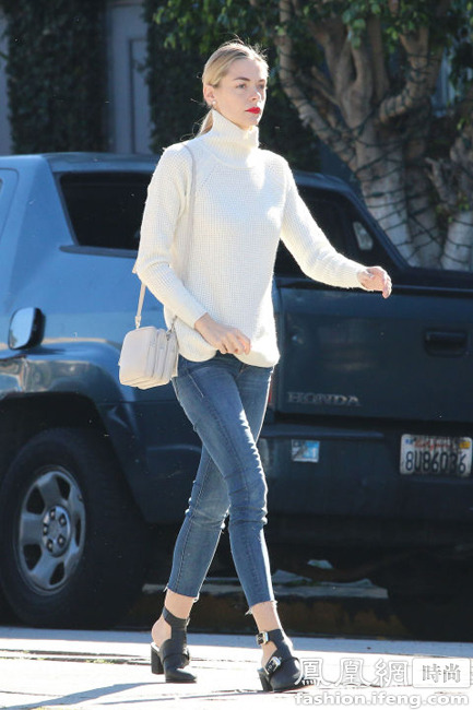 淺色系的針織衫是春季必備的單品,搭配牛仔和珍珠耳環(huán)絕對讓你立顯優(yōu)雅和氣場,緊身的牛仔褲關(guān)鍵在于七分長度剛剛好,一雙尖頭的高跟涼鞋讓美腿盡現(xiàn),整體造型簡潔又時髦!