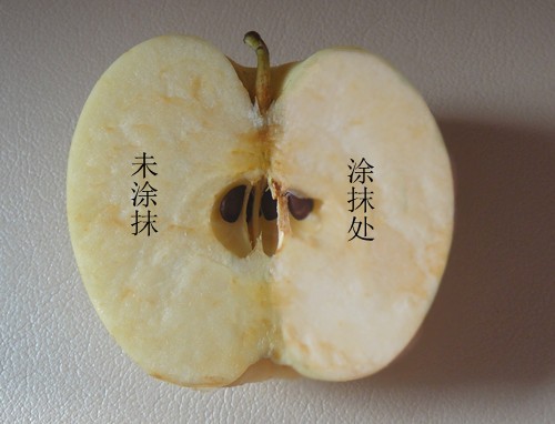 把涂抹了精華液的蘋果放在未見陽光的桌上4小時(shí)后,涂抹精華液的右面沒有氧化變黃,依然水分充足,滋潤(rùn)新鮮,而未涂抹的左面就因?yàn)檠趸兊冒迭S干澀。這就說明它的抗氧化性極強(qiáng),對(duì)肌膚有很強(qiáng)的保護(hù)作用。