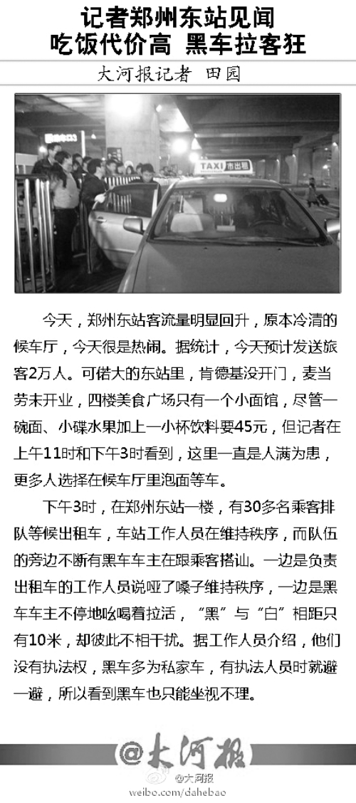 昨天,鄭州東站迎來一次客流小高峰,當(dāng)天,共發(fā)送旅客將近2萬人次。記者來到鄭州東站體驗(yàn)發(fā)現(xiàn),平素空曠無人的西廣場,出現(xiàn)了很多乘客的身影,三樓候車室也很熱鬧。但與熱鬧場景不相配的是,鄭州東站很多細(xì)節(jié)還未顧及到,吃飯代價(jià)高,“黑出租”與“白出租”公然搶生意。