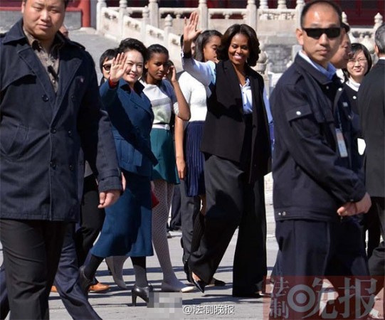 3月21日上午,美國總統(tǒng)夫人米歇爾參觀故宮,彭麗媛陪同。彭麗媛一身湖藍色裙裝,米歇爾黑白色職業(yè)裝扮,兩個女兒穿著清爽的休閑裙裝?! ?/font>