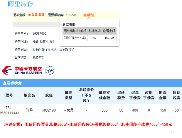 消保委質(zhì)疑:在購票前消費者并不知道退改簽規(guī)則,阿里拿著消費者的信息在東航退票,東航把錢退給代理商,代理商從中拿了50塊退給了消費者,阿里“吃掉”了部分退款手續(xù)費?