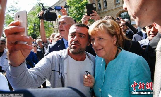 資料圖:柏林的一處難民營外,一位移民拿起手機(jī)與默克爾自拍合影。