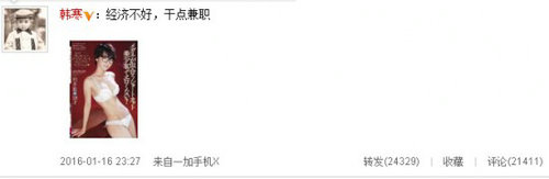1月16日晚,韓寒在微博曬出一張與自己撞臉的女優(yōu)的照片,并寫道:“經(jīng)濟(jì)不好,干點(diǎn)兼職??吹秸掌缶W(wǎng)友紛紛留言調(diào)侃,“帥,不解釋”、“你把岳父甩開幾條街”、“岳父的發(fā)卡好好看”、“岳父從硬漢到軟妹的蛻變”。