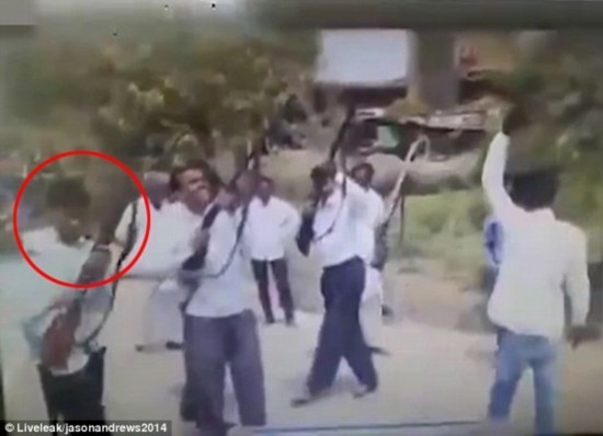 印度一對(duì)幸福新人26日于中央邦巴德納加爾舉行婚禮,賓客鳴槍?xiě)c祝時(shí)卻不慎誤射新郎父親,讓38歲的派特爾當(dāng)場(chǎng)倒地身亡。左一為鳴槍賓客,右一為受害者。