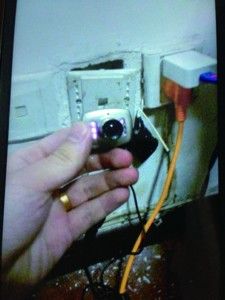 23歲的張成和妻子是安慶人。前些日子,兩人帶著兒子來合肥找工作。 4月26日,張成一家住進(jìn)了沁園賓館205房間。 17時(shí)許,張成和妻子去了洗浴間洗澡,“之后我一絲不掛坐在床上穿內(nèi)褲,妻子也沒穿衣服在床上哄孩子。 ”張成有些難堪地說,“隨后我拿起手機(jī),去電視機(jī)旁邊一插座上充電。 ”張成告訴記者,他剛要把手機(jī)插進(jìn)插座時(shí),突然發(fā)現(xiàn)插座上有一個(gè)小拇指甲蓋大小的圓洞,里面有紅光閃爍。張成讓妻子找來剪刀,把插座四個(gè)棱角慢慢摳下。幾分鐘后,眼前實(shí)物讓張成和妻子吃驚不已,“是針孔相機(jī)! ”
