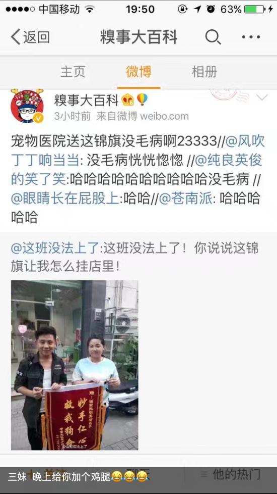 “狗狗三妹是今年4月份送到這里醫(yī)治的,8月7日送來了錦旗,和我們醫(yī)護(hù)人員合影。沒想到最近突然在微博火了,一覺醒來,很多客戶叫我網(wǎng)紅?!闭衩鲗櫸镝t(yī)院院子孫振明說,有人贊揚(yáng)勇氣,有人嘲笑謾罵,但如果你要是知道事情的始末,你就不會覺得可笑?這是一個(gè)關(guān)于愛、守護(hù)和堅(jiān)持的故事。