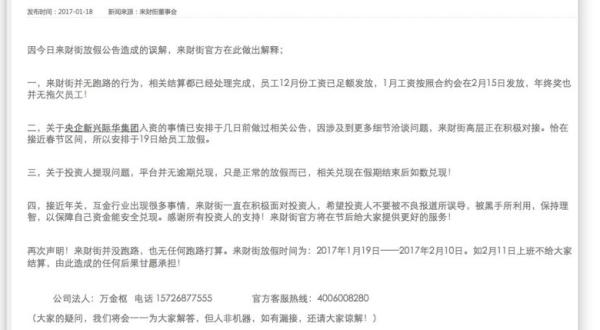 當(dāng)日,來(lái)財(cái)街官網(wǎng)首先發(fā)布了春節(jié)放假通告,稱因央企新興際華集團(tuán)旗下公司擬入股來(lái)財(cái)街母公司金弋資本,須對(duì)來(lái)財(cái)街公司運(yùn)營(yíng)狀況進(jìn)行全面審計(jì),同時(shí),根據(jù)國(guó)務(wù)院假日安排和公司實(shí)際情況,現(xiàn)來(lái)財(cái)街公布春節(jié)假期時(shí)間:2017年1月19日-2017年2月10日。這個(gè)假期已經(jīng)達(dá)到了23天,遠(yuǎn)遠(yuǎn)多于國(guó)家法定假日要求的時(shí)間。