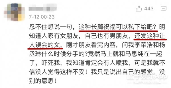然而,評論的畫風走向有點讓人意外。不少網(wǎng)友認為馬思純有歐豪了,李榮浩也有楊丞琳了,這種長文祝福信不應(yīng)該公開發(fā)↓