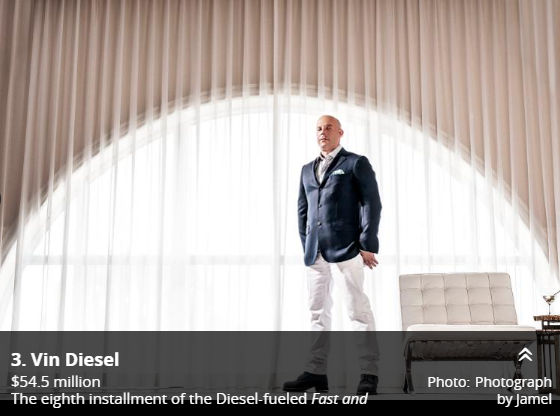 近年大熱的超英片,多位男主角均搒上有名,“鋼鐵俠”小羅伯特·唐尼(Robert Downey Jr)以4,800萬美元排第6,“雷神”克里斯·海姆斯沃斯(Chris Hemsworth)以3,150萬美元排11,“神盾局局長”塞繆爾·杰克遜(Samuel L. Jackson)以3,050萬美元排13,“死侍”瑞恩·雷諾茲(Ryan Reynolds)以2,150萬美元排15,“鷹眼”杰瑞米·雷納(Jeremy Renner)以1,900萬美元排17,“美國隊長”克里斯·伊文斯(Chris Evans)以1,800萬美元排18,“星爵”克里斯·普拉特(Chris Pratt)以1,700萬美元排19,“綠巨人”馬克·魯法洛(Mark Ruffalo)以1,300萬美元排20。