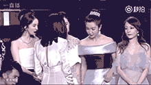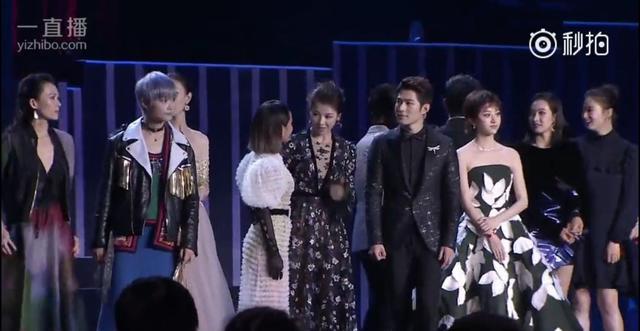 后來黃曉明隊和吳秀波隊的人一上來,舞臺上就滿了,而張韶涵的位置從劉嘉玲的右邊換到了劉嘉玲左邊,變成在李冰冰和劉嘉玲中間??梢钥吹剿?dāng)時也還是挺尷尬的。然后李冰冰和張韶涵身邊的劉嘉玲握手寒暄,張韶涵尷尬的站在原地。