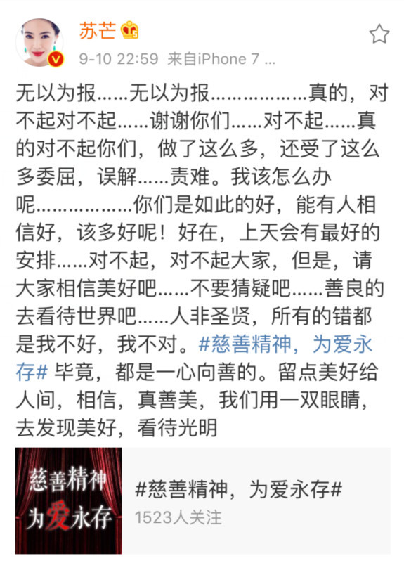 蘇芒微博全文:無以為報,無以為報……真的,對不起對不起,謝謝你們,對不起,真的對不起你們,做了那么多,還受這么多委屈、誤解、責(zé)難。我該怎么辦呢……你們是如此的好,能有人相信好,該有多好呢!好在上天會有最好的安排……對不起,對不起大家。但是請大家相信美好吧……不要猜疑吧……善良的去看待世界吧……人非圣賢,所有的錯都是我不好,我不對。畢竟,都是一心向善的。留點美好給人間,相信,真善美,我們用一雙眼睛,去發(fā)現(xiàn)美好,看待光明。