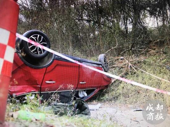 民警介紹,車輛在墜崖時時速非??欤瑝嬄鋾r水平距離至墜落點有80米左右,堡坎垂直高度達20米。幸好事發(fā)地點為斜坡式堡坎,坡上有茂密的植被緩沖,二人才得以保命。