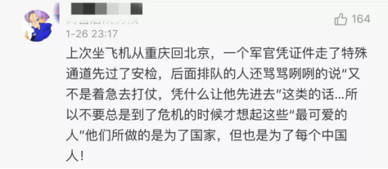 有網(wǎng)友就指出,在機(jī)場(chǎng)安檢口,一位軍人憑證件走軍人優(yōu)先窗口,卻有乘客罵罵咧咧地說(shuō):“又不是著急去打仗,憑什么讓他先進(jìn)去?”