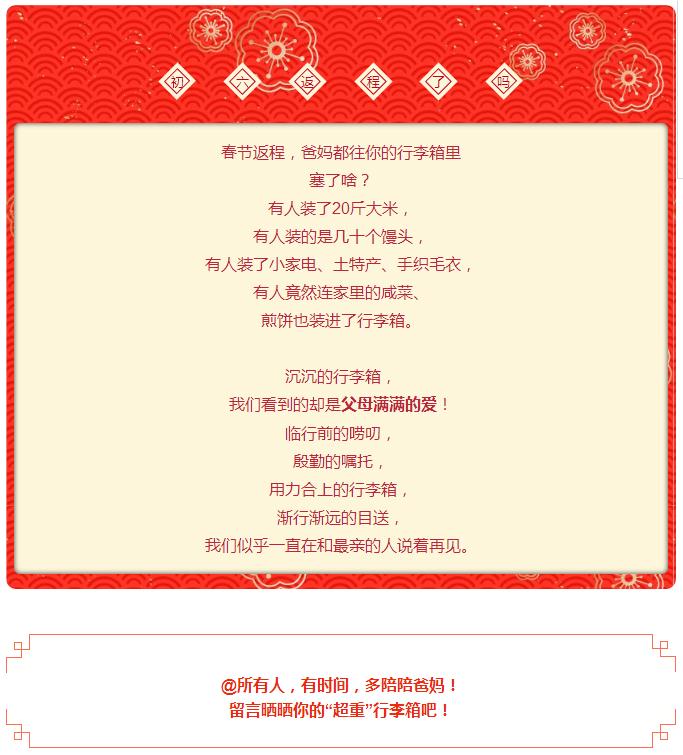 初六|今天你返程了嗎? 2018-02-21 15:54 來(lái)源:中國(guó)之聲 大年初六,你是不是已經(jīng)踏上了返程的道路? 大年初六, 你是不是已經(jīng)踏上了返程的道路?