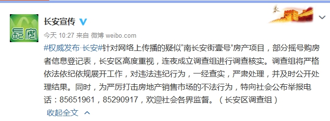 長安區(qū)委宣傳部表示,針對網(wǎng)絡上傳播的疑似“南長安街壹號”房產(chǎn)項目,部分搖號購房者信息登記表,長安區(qū)高度重視,連夜成立調查組進行調查核實。調查組將嚴格依法依紀依規(guī)展開工作,對違法違紀行為,一經(jīng)查實,嚴肅處理,并及時公開處理結果。同時,為嚴厲打擊房地產(chǎn)銷售市場的不法行為,特向社會公布舉報電話:85651961,85290917,歡迎社會各界監(jiān)督。