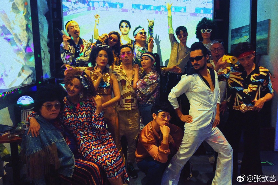 新浪娛樂訊 3日,張歆藝在微博曬出party照,并配文:“復(fù)古disco趴梯,我男人為了冠軍是有多么拼?!闭掌?,張歆藝與袁弘領(lǐng)銜,眾人都是上世紀(jì)80年代舞廳disco復(fù)古風(fēng)的打扮,群魔亂舞的畫面有點辣眼。