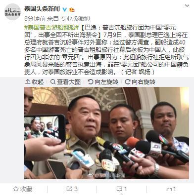 [環(huán)球網(wǎng)快訊 記者 趙衍龍]泰國(guó)頭條新聞7月9日消息,泰國(guó)副總理巴逸上將在總理府就普吉沉船事件對(duì)外宣稱(chēng):經(jīng)過(guò)警方調(diào)查,翻船造成40多名中國(guó)游客死亡的普吉租船旅行社幕后老板為中國(guó)人,此旅行團(tuán)為非法的“零元團(tuán)”。