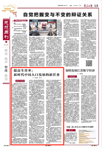 8月14日,江蘇省委機(jī)關(guān)報(bào)《新華日報(bào)》在第13版“思想周刊·智庫”欄目刊發(fā)了劉志彪、張曄聯(lián)合撰寫的題為《提高生育率:新時代中國人口發(fā)展的新任務(wù)》的署名文章。