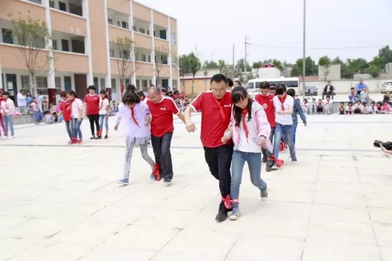 “加油,加油!”昨天,中牟黃店鎮(zhèn)中心小學(xué)的學(xué)生和志愿者們一起在廣播的音樂下玩著背靠背、兩人三足的游戲,大家玩得興高采烈。而這樣普通的游戲,這個(gè)學(xué)校的很多孩子是第一次玩兒。