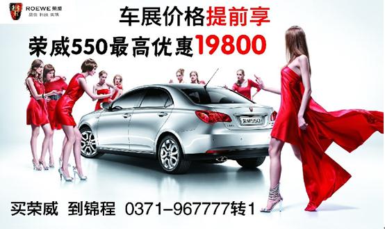 近日,編者從河南錦程榮威了解到,榮威車展價格提前享,榮威550最高直降1.98萬元。購榮威車的朋友們不用再擠車展,在優(yōu)雅的環(huán)境中提前享受有車生活,河南錦程榮威為廣大車友朋友們提供最實惠最保障的購車政策。買榮威汽車,到河南錦程看看再決定,搶購熱線:0371—967777轉(zhuǎn)1.