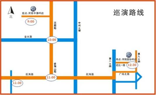 上午路線:進(jìn)口大眾河南中豫4S店——紫荊山路——航海路——進(jìn)口大眾河南中豫航海路展廳——進(jìn)口大眾河南國際4S店