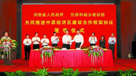 5月10日下午,河南省人民政府與住房和城鄉(xiāng)建設(shè)部在北京簽署《共同推進(jìn)中原經(jīng)濟(jì)區(qū)建設(shè)合作框架協(xié)議》,省委副書(shū)記、省長(zhǎng)郭庚茂,住房和城鄉(xiāng)建設(shè)部部長(zhǎng)姜偉新出席簽字儀式,并代表雙方簽署協(xié)議。