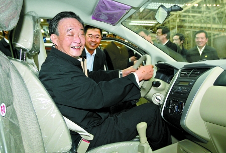 4月13日,中共中央政治局常委、全國人大常委會委員長吳邦國在東風日產(chǎn)(鄭州)有限公司考察工作。圖為吳邦國委員長坐上一輛銀色樣車,查看車內(nèi)配置情況。 河南日報記者 郭 宇 李建峰 攝